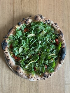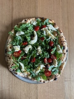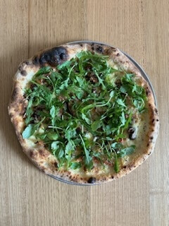 White pizza, rocket, plum tomato, mozza, basil, balsamic